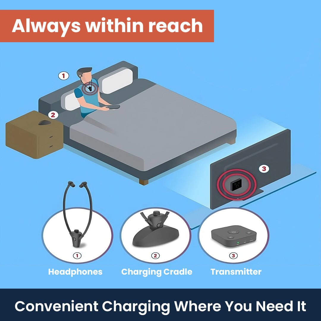 With HearSound Wireless Headphones(1) you can keep them conveniently charged right by your bedside or nightstand, always ready exactly where you need them in their convenient charging cradle(2).